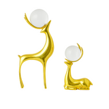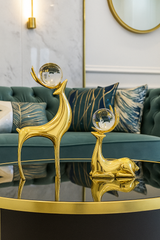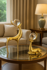 Add a luxurious and whimsical touch to your decor with this elegant set of two gold reindeer sculptures. Featuring sleek, elongated forms and a polished metallic finish, each reindeer balances a crystal-clear globe delicately between its antlers. The combination of smooth gold surfaces and glass orbs creates a sophisticated visual contrast, making them perfect for coffee tables, consoles, or festive displays. Whether styled together or separately, these sculptures exude charm, elegance, and modern artistry.